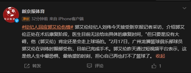 - 经纪人回应郭艾伦伤势:正处康复阶段 医生无法给出具体康复时间