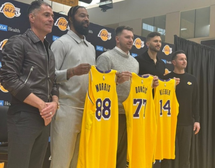 东契奇、莫里斯和克莱伯亮相发布会 佩林卡雷迪克左膀右臂