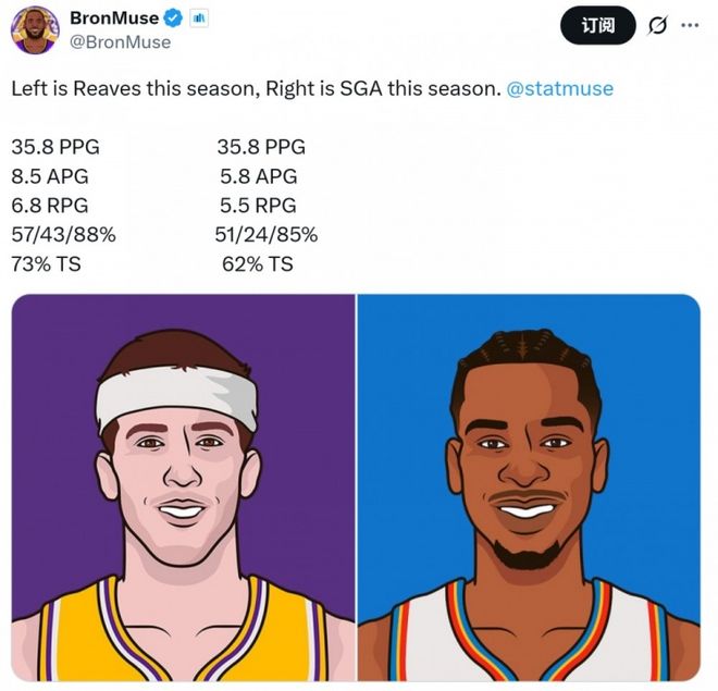第四,里夫斯本季场均35.8分+6.8篮板+8.5助攻,SGA则是场均35.8分+5.5篮板+5.8助攻。