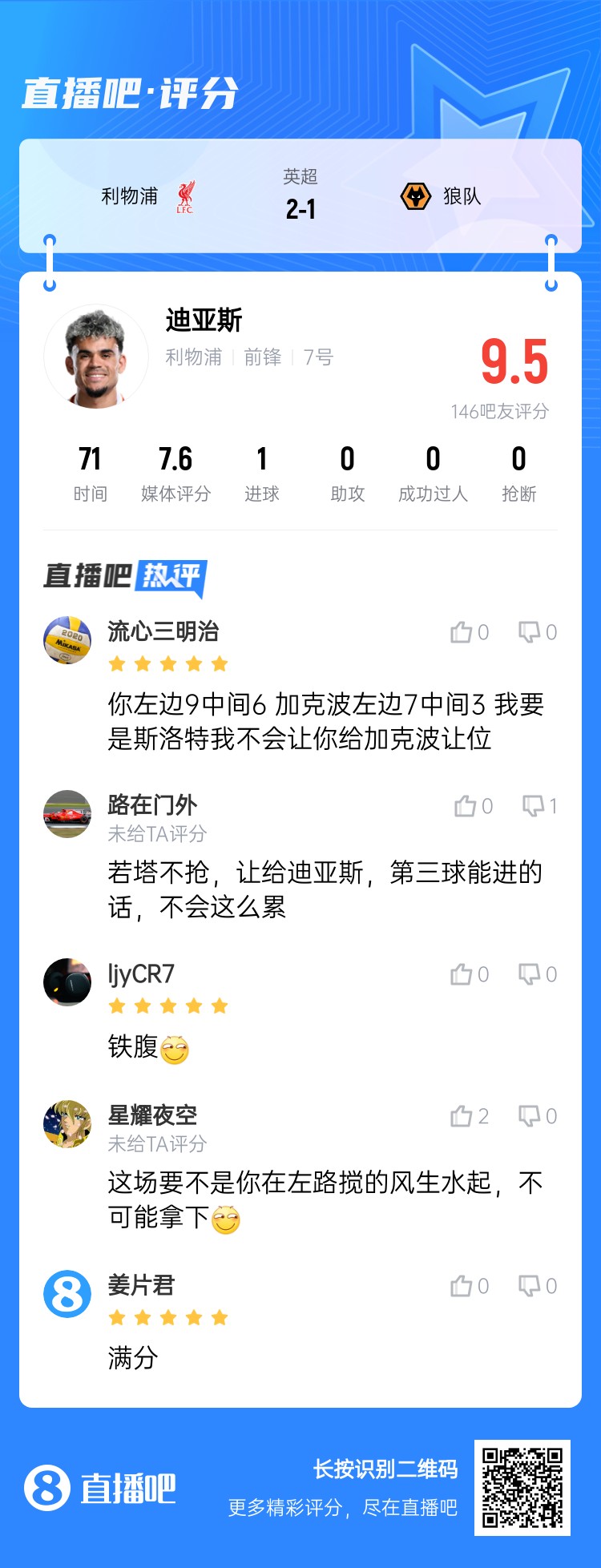 - 路易斯-迪亚斯本场1球+1造点 3造犯规+8对抗3成功 7.6分全队最高