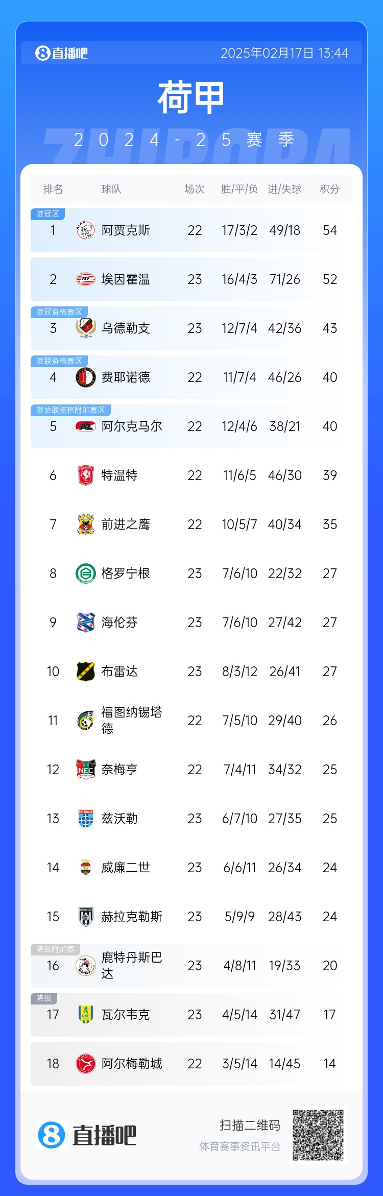 - 杀疯了!贾府7连胜少赛一场2分领跑荷甲,埃因霍温狂轰31脚憾平