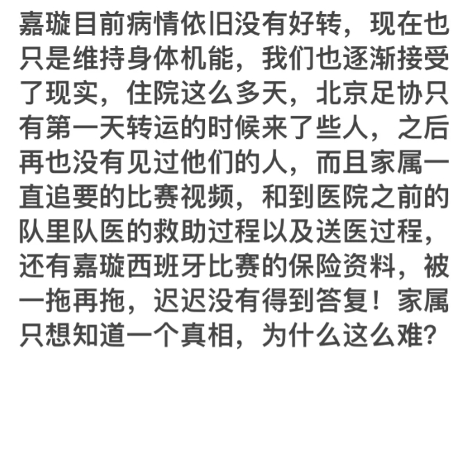 嘉璇目前病情依旧没有好转,现在也只是维持身体机能,5G影院天天爽也逐渐接受了现实,住院这么多天,北京足协只有第一天转运的时候来了些人,之后再也没有见过他们的人,而且家属一直追要的比赛视频,和到医院之前的队里队医的救助过程以及送医过程,还有嘉璇西班牙比赛的保险资料,被一拖再拖,迟迟没有得到答复!家属只想知道一个真相,为什么这么难?