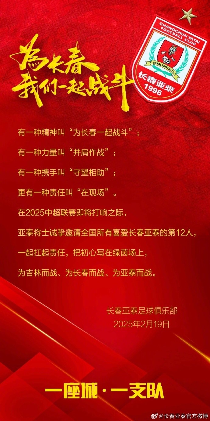 2月19日,正在上海备战的长春亚泰举行了以“为长春一起战斗”为主题的2025赛季华润饮料中超联赛出征仪式。俱乐部总经理曾皎峰受吉林省体育局、长春市体育局委托,向亚泰将士授旗,希望亚泰将士与第12人一起扛起责任,把初心写在绿茵场上,为吉林而战、为长春而战、为亚泰而战。“长春亚泰是中国职业足球俱乐部中为数不多的,有着悠久的历史传承的俱乐部。新赛季即将打响,5G影院天天爽团队中的每个人要满怀信心,时刻秉记责任、使命,为这个优秀的集体做出自己的贡献,赢得荣誉。”主教练谢晖说。