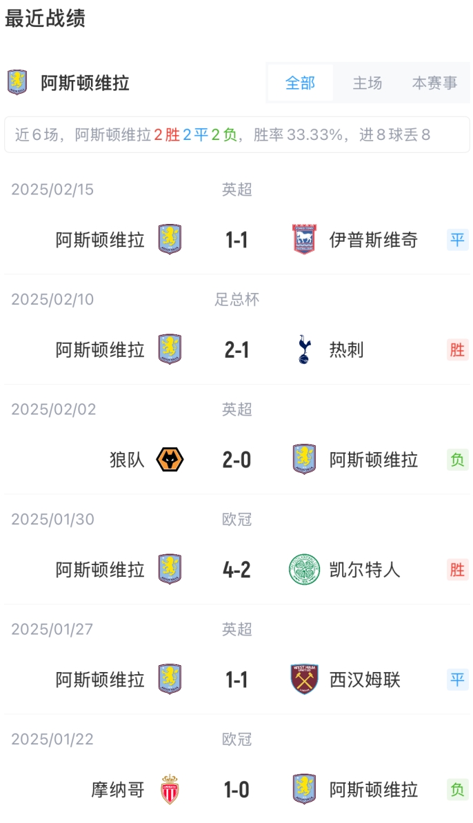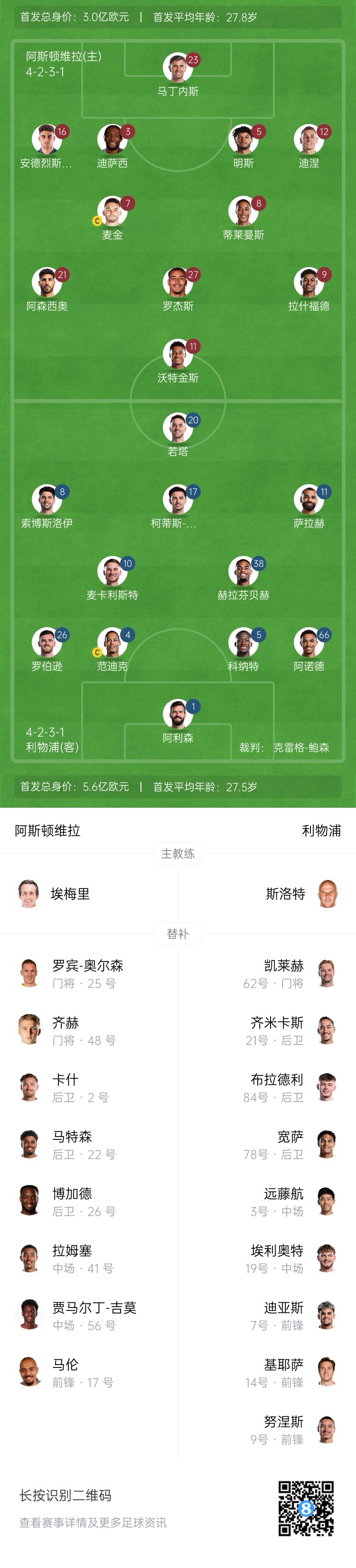 维拉首发:23-马丁内斯、16-加西亚、3-迪萨西、5-明斯、12-迪涅、21-阿森西奥、8-蒂莱曼斯、7-麦金、9-拉什福德、27-罗杰斯、11-沃特金斯