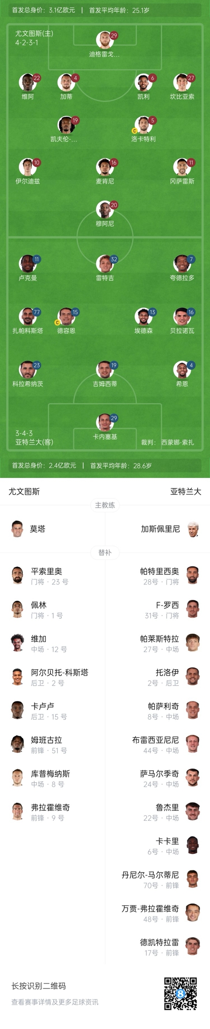 - 尤文vs亚特兰大首发:穆阿尼、伊尔迪兹、冈萨雷斯出战
