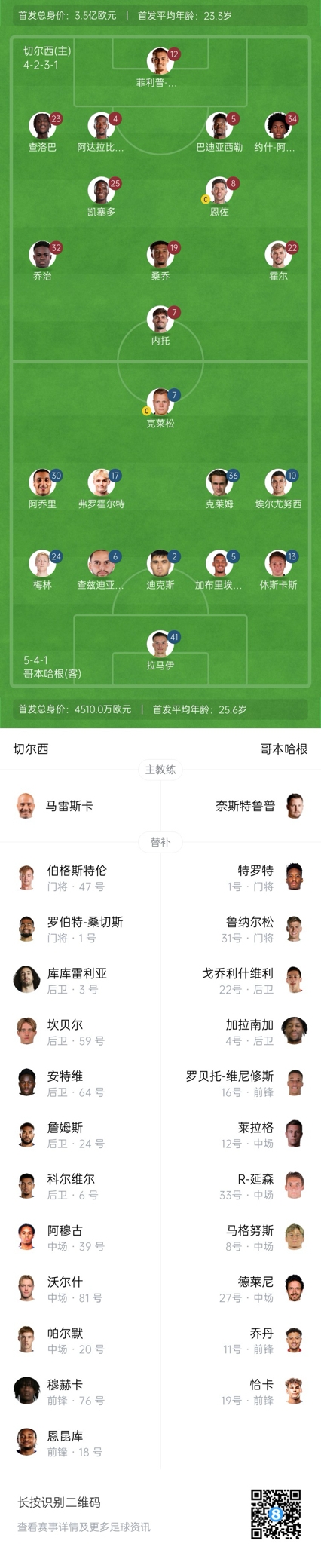 切尔西替补:1-罗伯特-桑切斯、47-伯格斯特伦、6-科尔维尔、59-坎贝尔、3-库库雷利亚、64-安特维、24-里斯-詹姆斯、39-阿穆古、81-沃尔什、20-帕尔默、76-穆赫卡、18-恩昆库