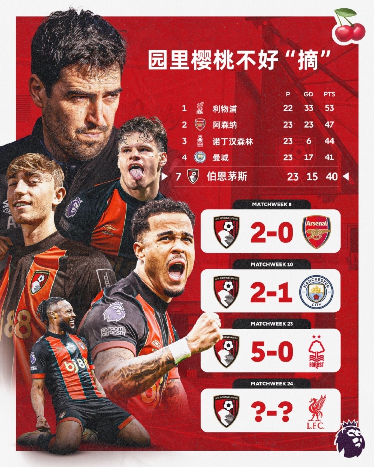- 伯恩茅斯本赛季英超主场面对前四球队均能取胜,本轮迎战利物浦