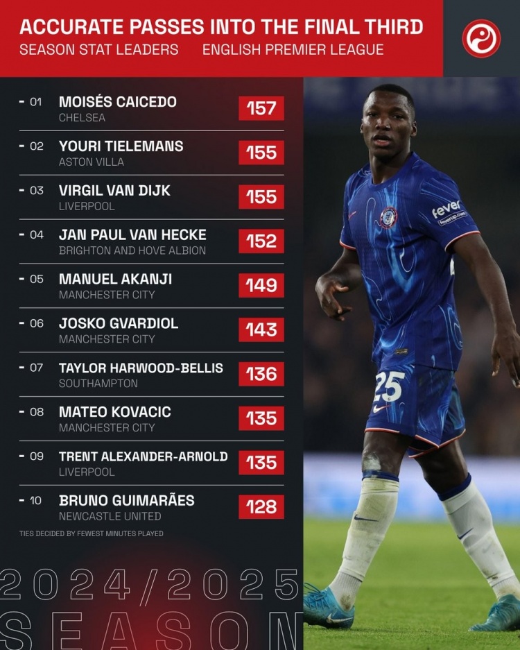 - 英超传球到进攻三区榜:凯塞多压范迪克居首,曼城3将在列