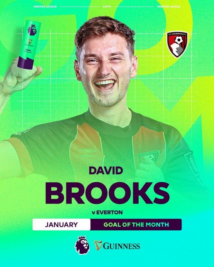 2月7日讯 英超官方宣布,伯恩茅斯边锋大卫-布鲁克斯对阵埃弗顿的凌空破门,当选英超1月最佳进球。