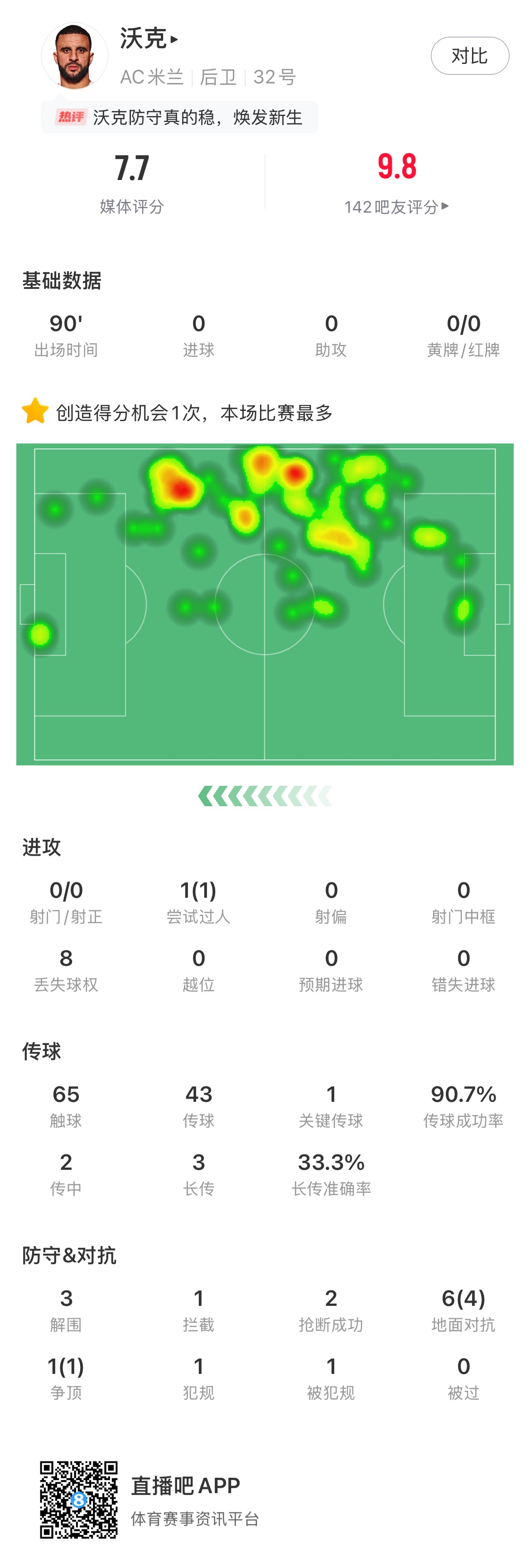 本场沃克1次过人0次被过,6次对抗4次成功,防守数据方面还有3次解围,1次拦截和2次抢断。